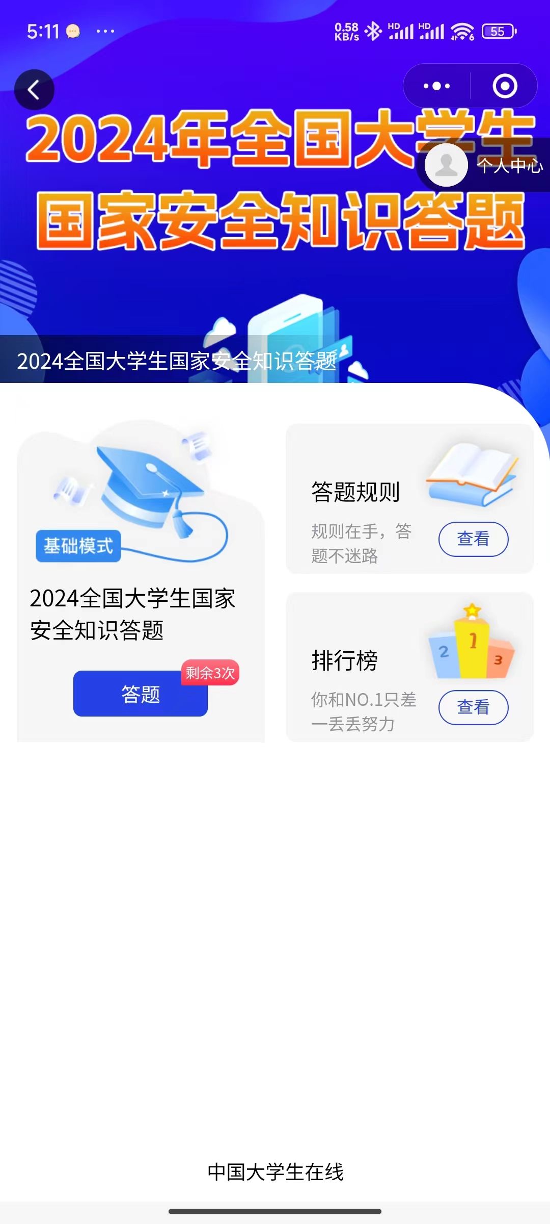 2.每人有三次答题机会,每次答题时间10分钟。