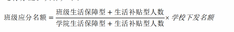 (1)各班级应分名额分配根据班级生活保障型和生活补贴型总人数占全院生活保障型和生活补贴型总人数比例进行分配。具体如下: