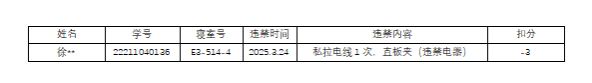 在公司第四周开展的公寓安全排查工作中,发现有 1 位同学存在私拉电线及违规使用电器的行为,此行为违反了《3044永利集团员工管理规定》。依据公司相关规章制度,现对该同学进行院内通报批评(具体名单如下),并按照规定扣除其文明品行分 3 分 / 人次。望全体同学以此为鉴,严格遵守校规校纪,共同维护校园安全。