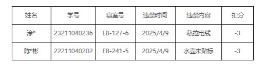 在公司第七周开展的公寓安全排查工作中,发现有 2 位同学存在私拉电线及违规使用电器的行为,此行为违反了《3044永利集团员工管理规定》。依据公司相关规章制度,现对该同学进行院内通报批评(具体名单如下),并按照规定扣除其文明品行分 3 分 / 人次。望全体同学以此为鉴,严格遵守校规校纪,共同维护校园安全。