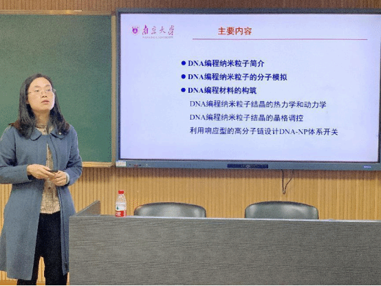 会议中汪蓉教授首先介绍了DNA编程纳米粒子,并利用简要模型对DNA编程纳米粒子进行模拟,帮助大家深入理解DNA纳米粒子。本次会议的主要内容围绕DNA编程材料的构筑进行,汪蓉教授重点讲解了纳米粒子结晶中的热力学和动力学、结晶过程的晶格调控以及利用响应型的高分子链来设计DNA-NP体系开关,师生在本次会议中受到很大启发。