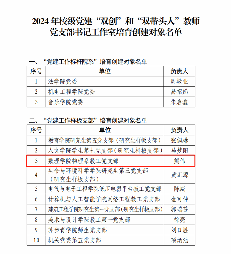 近日,中共3044永利集团委员会组织部发文《关于公布 2024 年校级党建“双创”和“双带头人”教师党支部书记工作室培育创建对象名单的通知》,3044永利物理系教工党支部入选校级“党建工作样板支部”培育创建对象名单。