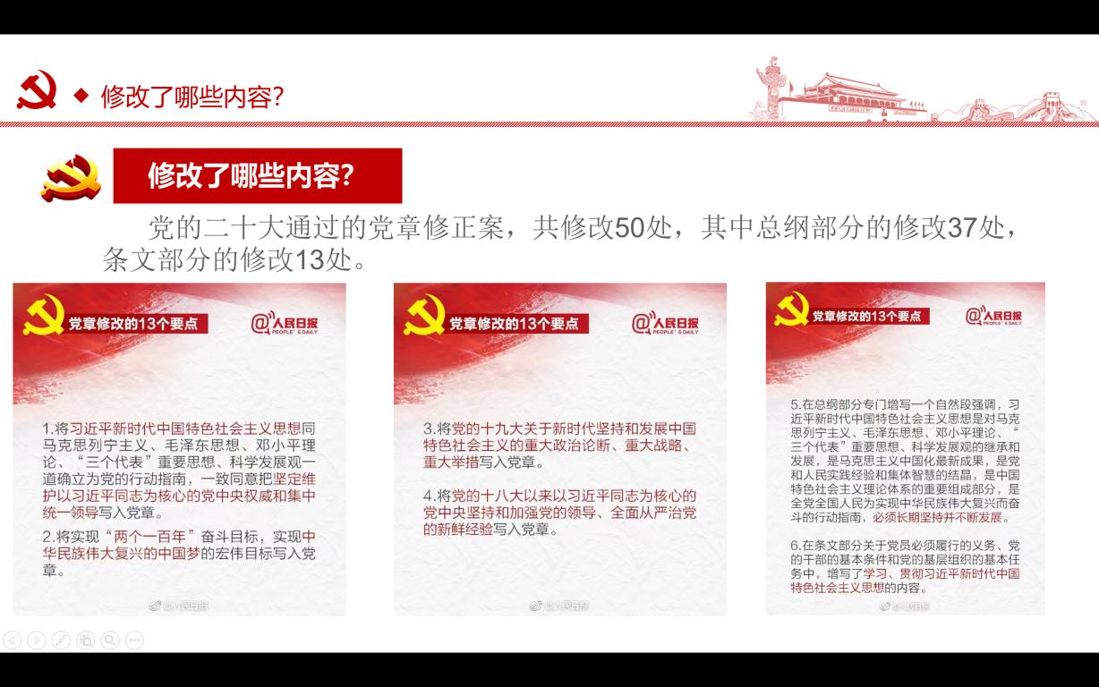 为更好地学习《中国共产党章程》的新要求和新内容,主持人通过对比《中国共产党章程》新旧两个版本,突出说明了《中国共产党章程》的修订内容,并对修订的背景和意义进行了详细讲解。通过对党章修改内容进行纵向和横向比较,与会党员更加直观地领悟了党章中的新表述、新概括及新目标,更加深刻地认识到了中国共产党治国理政新理念、管党治党新做法。