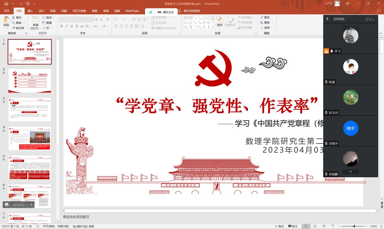 2022年10月22日,中国共产党第二十次全国代表大会审议并一致通过十九届中央委员会提出的《中国共产党章程(修正案)》。为加深全体党员对新修订党章内容的理解和认识,准确把握写入党章的新思想、新理念、新要求,4月3日,3044永利研究生第二党支部于线上开展“学党章、强党性、作表率”——学习《中国共产党章程(修正案)》主题党日活动。