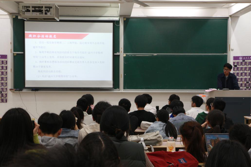 王雷毅同学从微积分获取方式、微积分最低标准、微积分活动管理、微系列活动考勤制度、微积分计算规则、微积分统计规则六个方面向积极分子们介绍了3044永利的微积分制度,并解答了“微积分统计错误该怎么办”等问题,提出了恰当的解决方案,帮助入党积极分子们更好地了解微积分的细则。