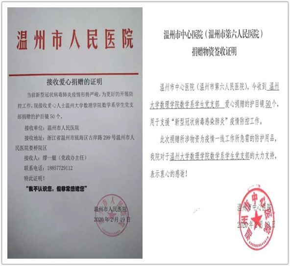 募捐活动自开展以来,截止2月10日,数学系员工党支部共收到99份善款,累计金额8573.16元。其中3538元善款用于购买护目镜捐赠给温州市中心医院和温州市人民医院,5066元善款用于购买n95口罩捐赠给乐清市卫生健康局。