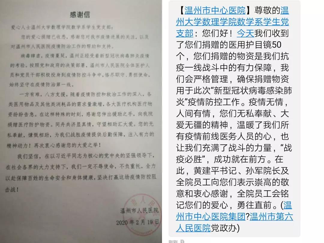 2.2月19日 数学系员工党支部将100副护目镜捐赠给温州市中心医院和温州市人民医院
