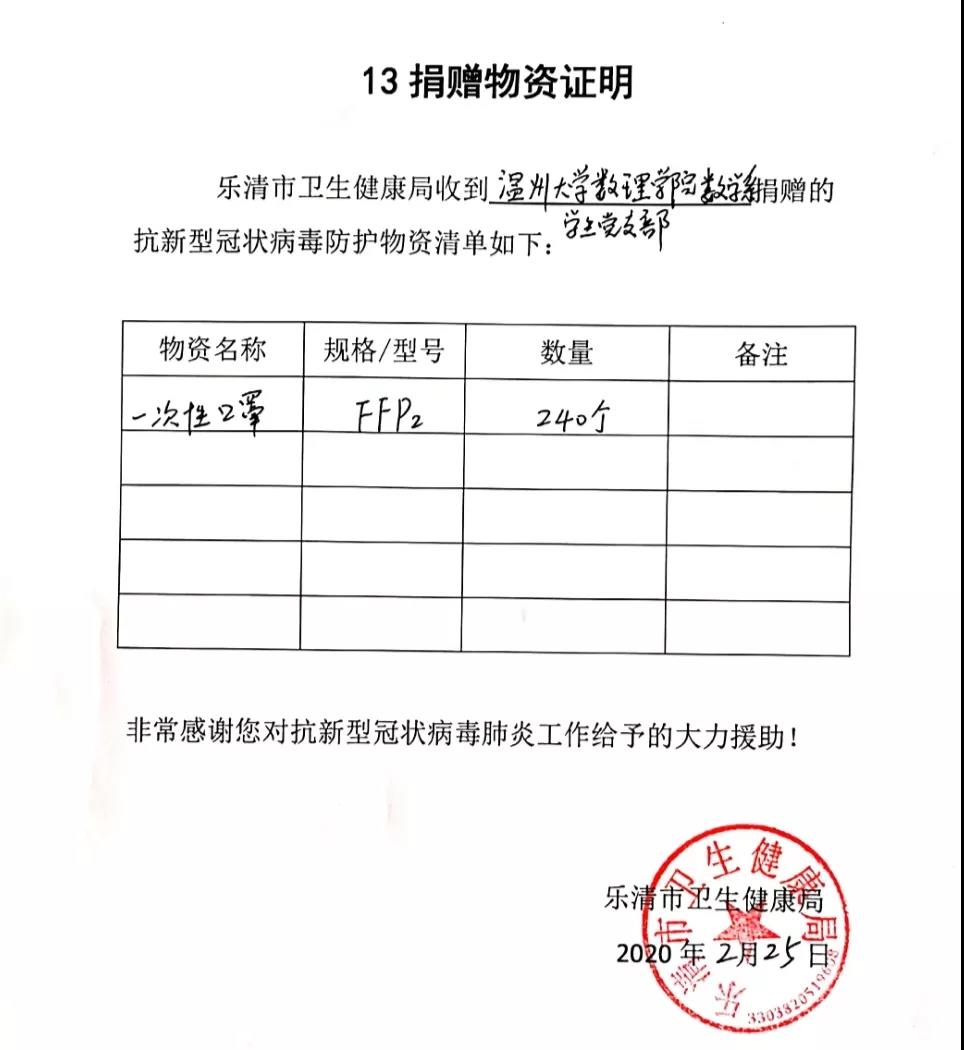 3.2月25日 数学系员工党支部购入240个n95口罩,捐赠给乐清市卫生健康局