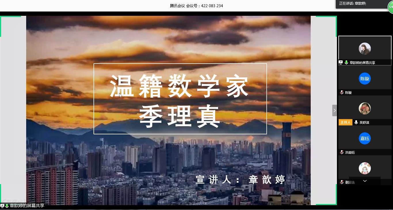 13:30活动正式开始,先后由黄建刚同志宣讲数学家柯召的故事;谢露逸同志宣讲数学家苏步青的故事;陈忆盼同志宣讲数学家白正国的故事;章歆婷同志宣讲数学家季理真的故事;陈萍同志宣讲数学家谷超豪的故事;吴雨琦同志宣讲数学家姜立夫的故事;共6位同志宣讲了6位温籍数学家故事,介绍了数学家的生平和典型事迹。宣讲结束后,主持人吴舒淇同志做总结,然后在微信群进行投票,最后谢露逸同志以22票被评为“最佳数学家故事宣讲人”。至此,“讲数学家故事,扬数学家精神”线上特色活动顺利结束。