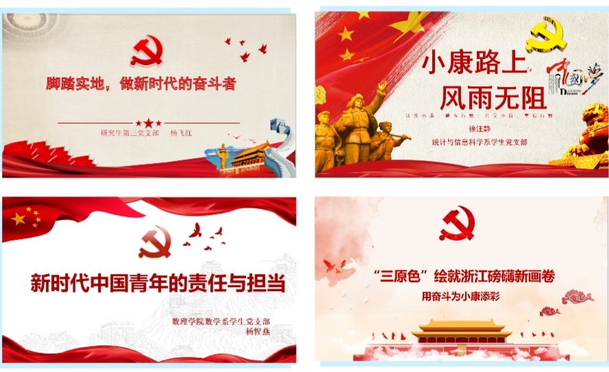 本次大赛16名选手围绕着大赛主题,以脚踏实地做新时代的奋斗者、“三原色”绘就浙江磅礴新画卷、小康路上风雨无阻、新时代中国青年的责任与担当、90后:新时代的引路人等为主题进行了精彩的讲解与讨论,图文并茂、生动形象,以讲故事的方式阐述个人观点,以小见大、寓理于情,增强了党课的吸引力和感召力,引起听众共鸣。其中研究生第三党支部的杨飞红同学从对浙江省安吉县最大的石灰岩开采区余村的介绍入题,用安吉这座小山村十多年的蜕变启发我们决胜小康,必须要脚踏实地,争做新时代的奋斗者。也教育我们要学会担当,做一粒负重的沙;学会奉献,做润土的一滴水;学会奋斗,做生根的一粒种。统计与信息科学系员工党支部的陈俊妍同学介绍了“华盛渔加1号”的发明者陈善平的奋斗故事、讲述了习近平总书记南湖之行的全程讲解员—袁晶的守望者精神、传递了83岁的“民间河长”汪孙聚老人的敬业精神。激励我们以奋斗为笔,以三原色为丹青,让浙江这幅悠长的画卷,在新时代的长征路上,留下浓墨重彩的一笔。