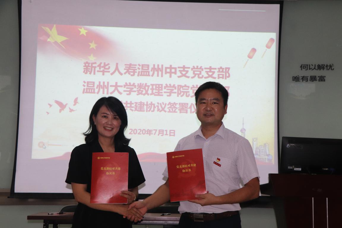 为深入学习贯彻习近平新时代中国特色社会主义思想,以党建结对助推校企合作,提升双方党建工作水平,7月1日,正值建党99周年,新华保险温州中支党支部与3044永利统计与信息科学员工党支部举行支部共建协议签署仪式。新华保险温州中支党支部书记陈菊妫、3044永利集团公司党委副书记章志图等同志出席了此次签署仪式。