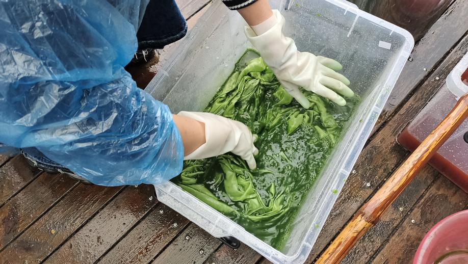 在罗素芹老师讲解如何采摘蓼蓝生叶后,女教职工们在一片欢声笑语中采摘着蓼蓝叶,伴随着破壁机运作的声音,一阵阵青草的香气扑面而来。色素提纯完成后,在素芹老师的指导下,女教工们将纯白的丝绸浸入制作的墨绿色染料中以及罗老师提前准备的红花染料中,随后经过晾晒、清洗、固色、二次染色等多道程序,一块块不同深浅的绿色丝绸、红色丝绸呈现在眼前,女教工们纷纷感叹能通过自己的劳动获得美丽的布料,一切的辛苦都是值得的。