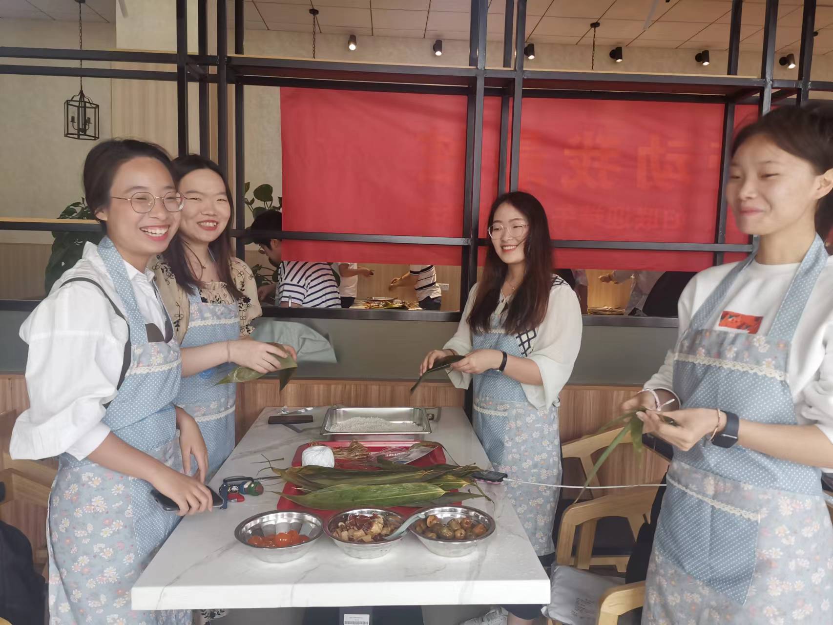 在包粽子的过程中,大家相互交流、互相学习。从未包过粽子的老师和同学在何林李、黄玉飞及叶敏等老师的指导下,认真学习包粽子的手法,逐渐掌握了包粽子的技巧。师生们满怀热情,耐心有加,拿着准备好的原材料,折粽叶、装糯米、剪粽绳、拴粽子。