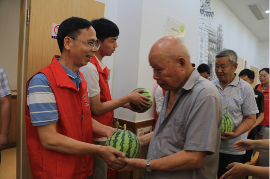 “这么热的天,你们老员工志愿者帮助我们清洁社区环境,给我们社区老人送来西瓜,还上门看望和陪伴独居老人,给老人们带来快乐和好心情,真是太感谢你们了……”7月7日上午,茶山街道养老服务中心主任林文港在山根社区握着温大“阳光”志愿者鲁逸晨同学的手,真诚地表达自己的感谢之情。