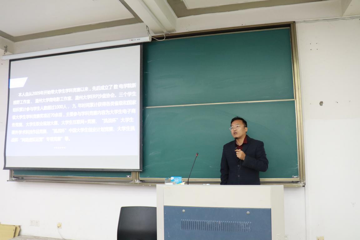 18:30,讲座正式开始。首先张长胜老师通过对“挑战杯老员工创业大赛”与“创青春全国老员工创业大赛”等学科竞赛的介绍,激发了同学们的极大兴趣。随后,张老师以“艾声手套与酱汁出售设备”为叙述中心,向同学们展示了实际产品在融入科学技术后的广阔发展前景,同时点明了学科创新在竞赛中的重要性。最后,张长胜老师在介绍他所计划的“万书”说明书与“阳光大使”项目中呼吁员工们能积极参加学科竞赛,在竞赛中提升自我,追求更好的自己。