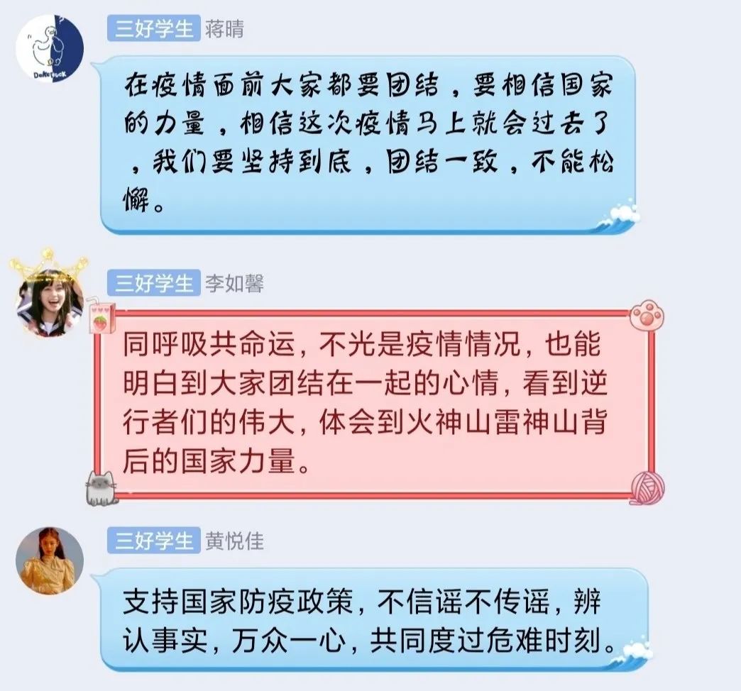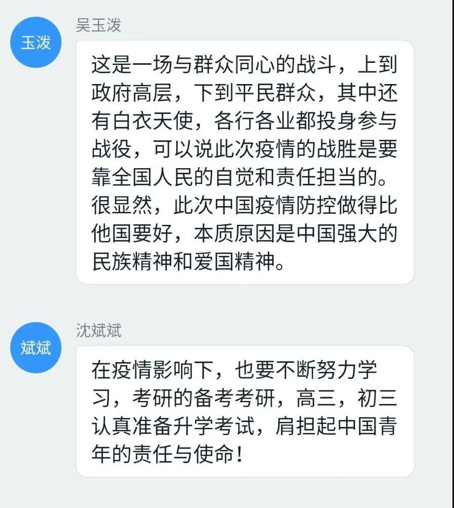 本次课程解读了以习近平同志为核心的党中央关于疫情防控的决策部署,分析了中国抗疫彰显的中国共产党领导和中国特色社会主义制度的显著优势,讲述了防疫战疫一线的感人故事,发挥了高校思政课落实立德树人根本任务的关键课程作用。各班同学观看完视频之后在班级群中针对疫情防控内容、措施、原则等方面进行了深度的交流讨论,同时还发表了个人对疫情防控思政课的学习心得。
