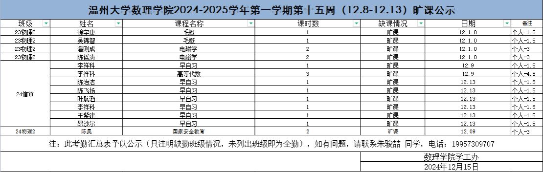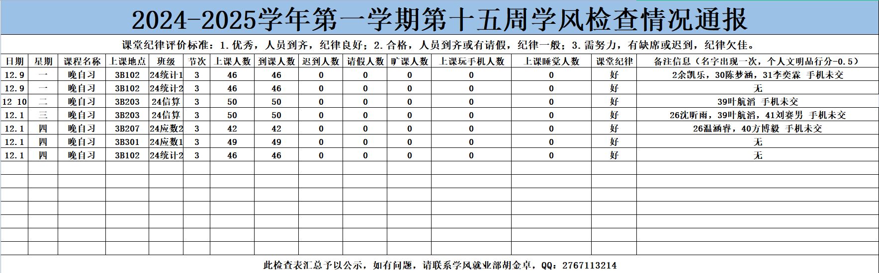 附件:第十五周旷课公示.xlsx 学风检查通报第十五周.xlsx 第十五周考勤表.xlsx