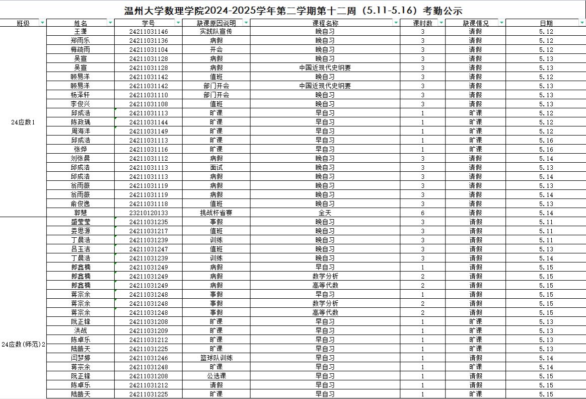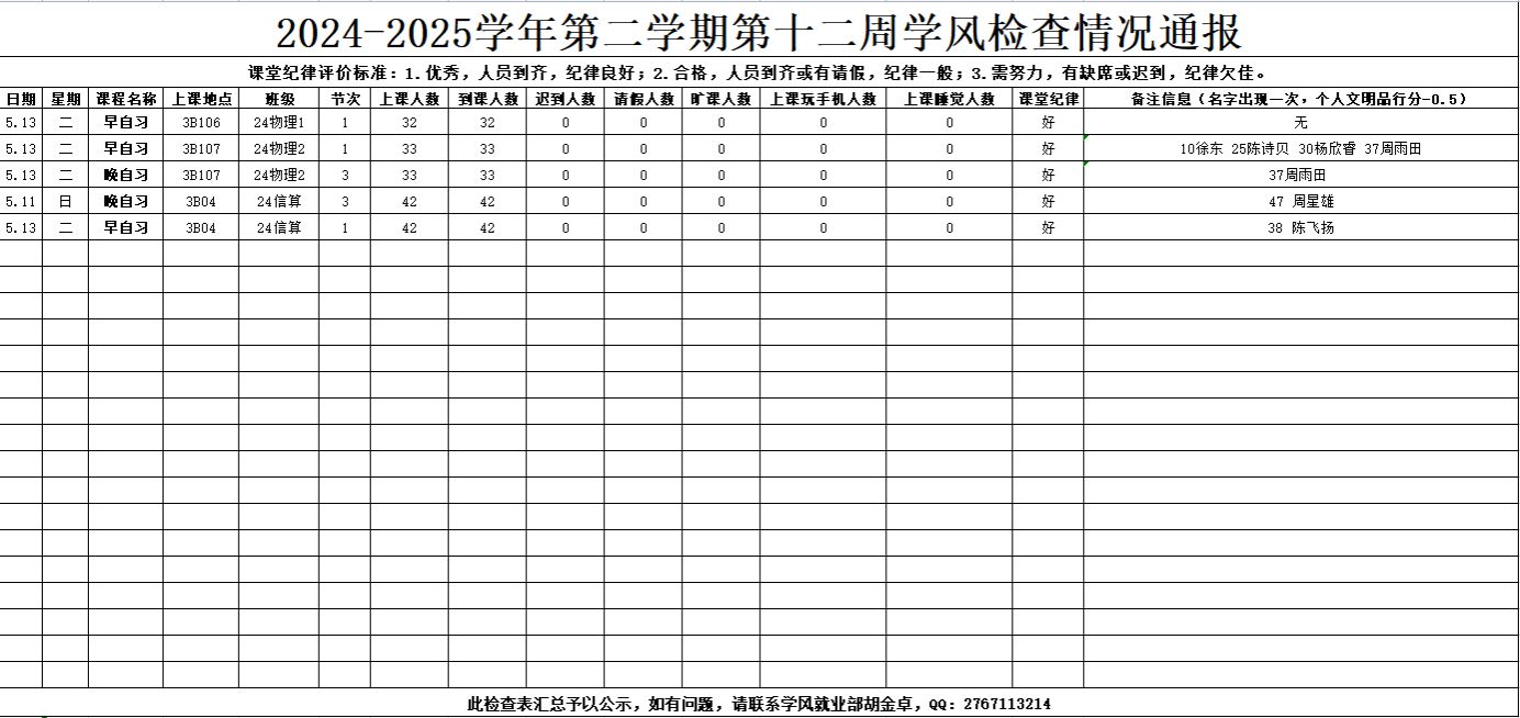 3044永利2024-2025学年第二学期第十二周(5.11-5.16)考勤结果公示