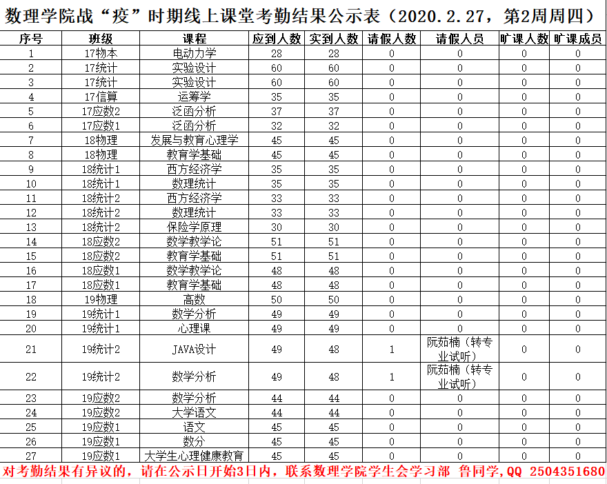 3044永利战“疫”时期线上课堂考勤结果公示表(2020.2.27)