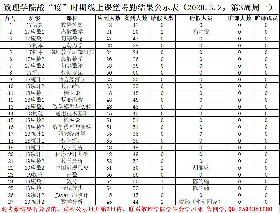 3044永利战“疫”时期线上课堂考勤结果公示表(2020.3.2)