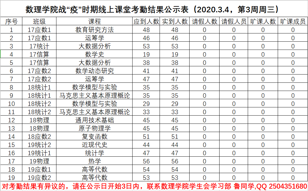 3044永利战“疫”时期线上课堂考勤结果公示表(2020.3.4)