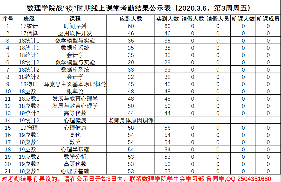 3044永利战“疫”时期线上课堂考勤结果公示表(2020.3.6)