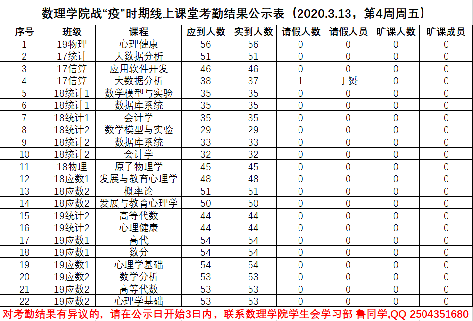 3044永利战“疫”时期线上课堂考勤结果公示表(2020.3.13)