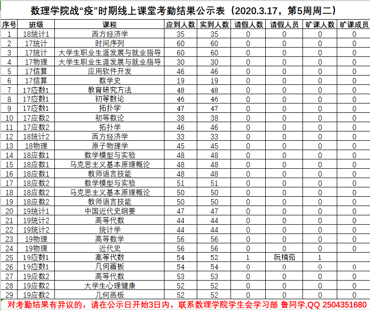 3044永利战“疫”时期线上课堂考勤结果公示表(2020.3.17)