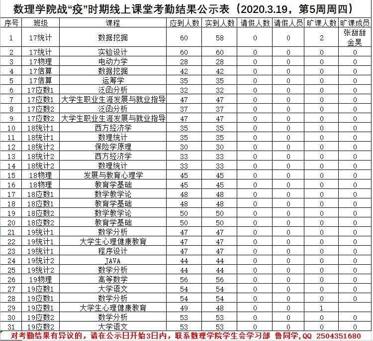 3044永利战“疫”时期线上课堂考勤结果公示表(2020.3.19)