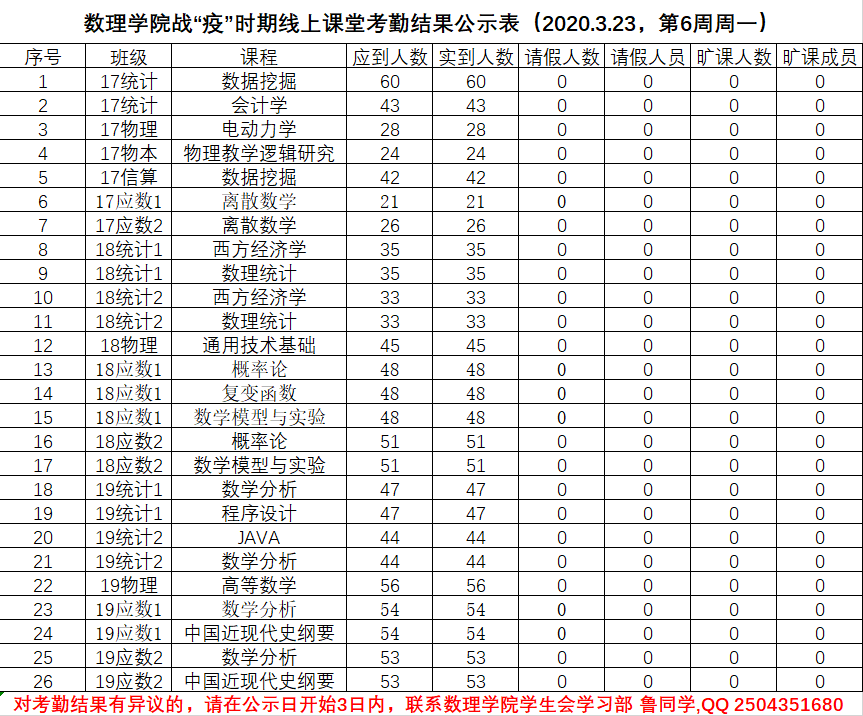 3044永利战“疫”时期线上课堂考勤结果公示表(2020.3.23)