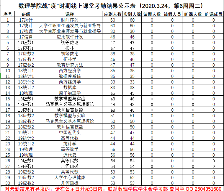 3044永利战“疫”时期线上课堂考勤结果公示表(2020.3.24)