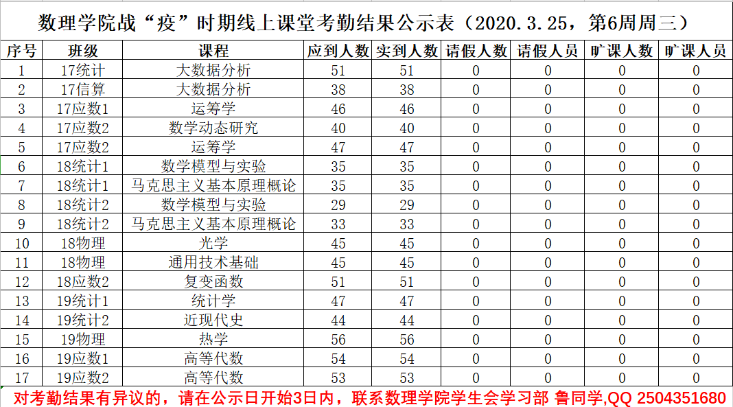 3044永利战“疫”时期线上课堂考勤结果公示表(2020.3.25)