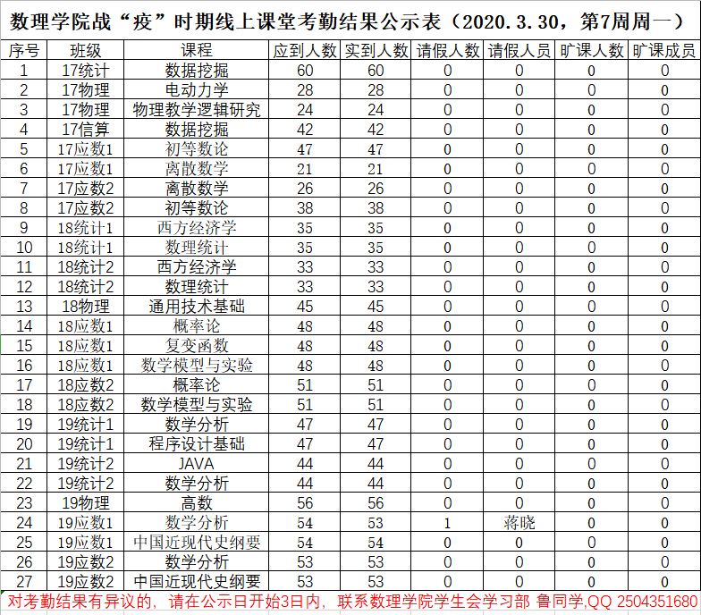 3044永利战“疫”时期线上课堂考勤结果公示表(2020.3.30)