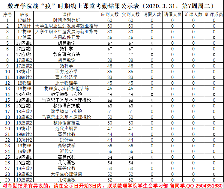 3044永利战“疫”时期线上课堂考勤结果公示表(2020.3.31)