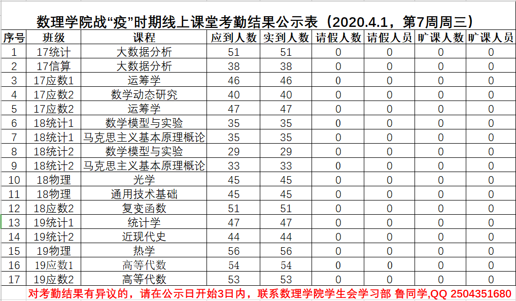 3044永利战“疫”时期线上课堂考勤结果公示表(2020.4.1)