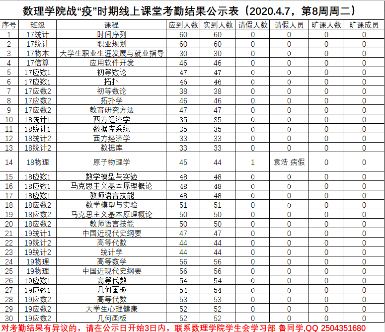 3044永利战“疫”时期线上课堂考勤结果公示表(2020.4.7)