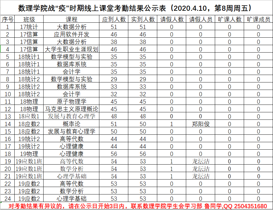 3044永利战“疫”时期线上课堂考勤结果公示表(2020.4.10)