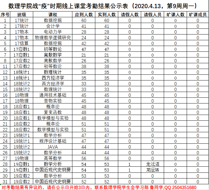 3044永利战“疫”时期线上课堂考勤结果公示表(2020.4.13)