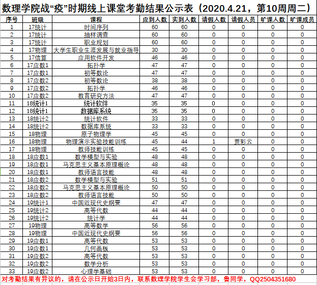 3044永利战“疫”时期线上课堂考勤结果公示表(2020.4.21)