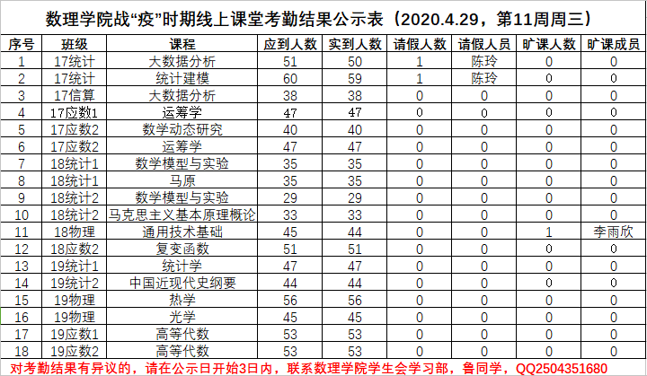3044永利战“疫”时期线上课堂考勤结果公示表(2020.4.29)