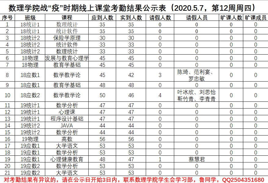 3044永利战“疫”时期线上课堂考勤结果公示表(2020.5.7)
