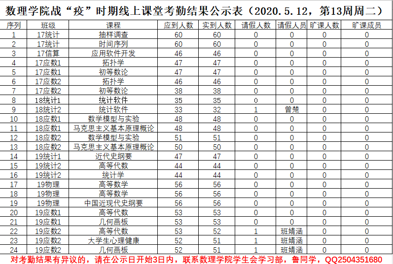 3044永利战“疫”时期线上课堂考勤结果公示表(2020.5.13)