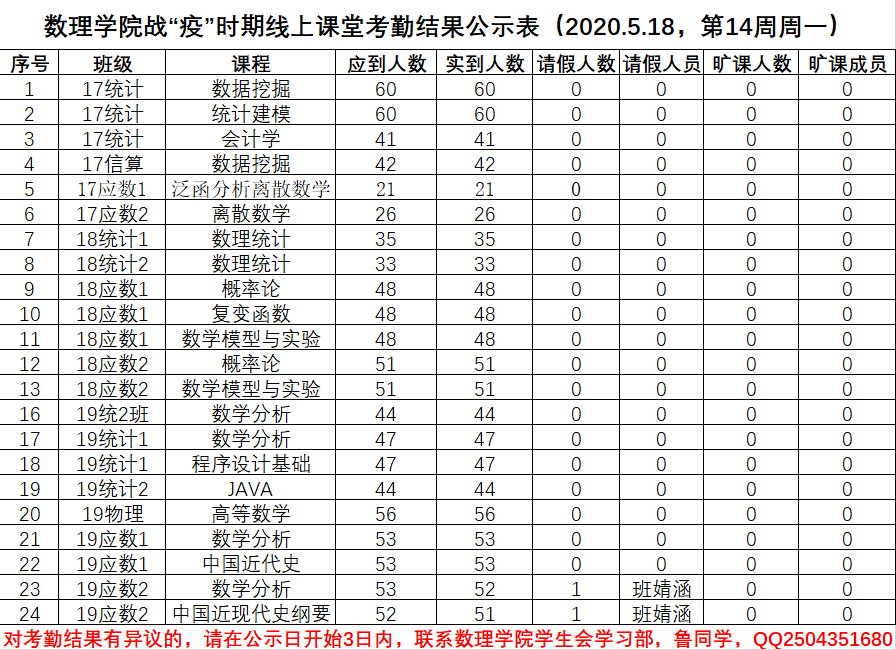 3044永利战“疫”时期线上课堂考勤结果公示表(2020.5.18)