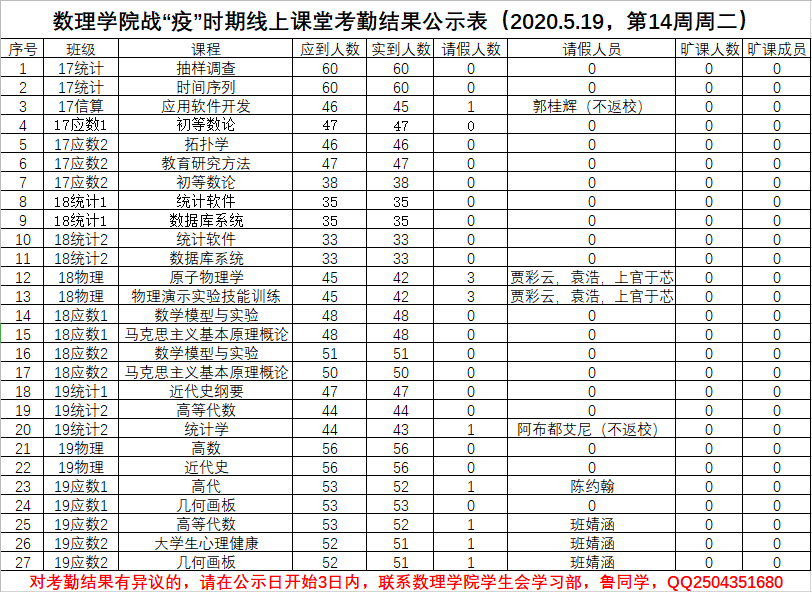 3044永利战“疫”时期线上课堂考勤结果公示表(2020.5.19)