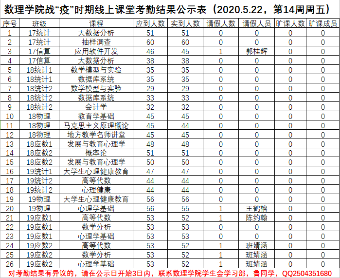 3044永利战“疫”时期线上课堂考勤结果公示表(2020.5.25)