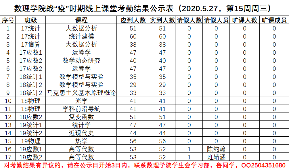 3044永利战“疫”时期线上课堂考勤结果公示表(2020.5.27)