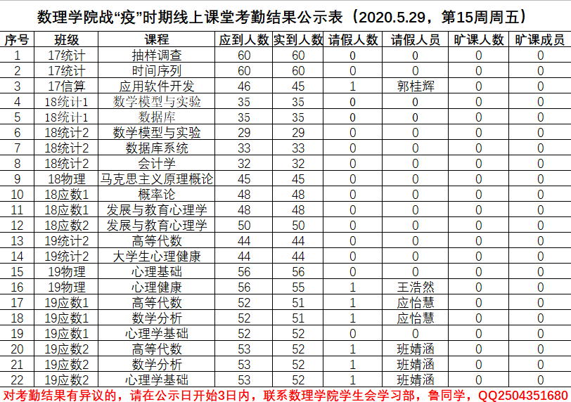 3044永利战“疫”时期线上课堂考勤结果公示表(2020.5.29)