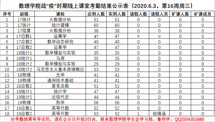 3044永利战“疫”时期线上课堂考勤结果公示表(2020.6.3)