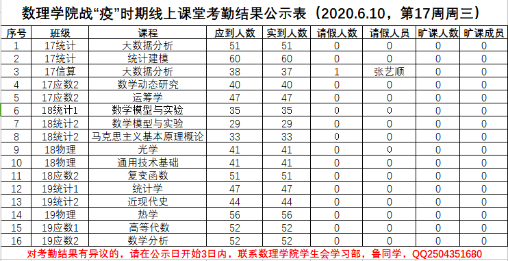 3044永利战“疫”时期线上课堂考勤结果公示表(2020.6.11)