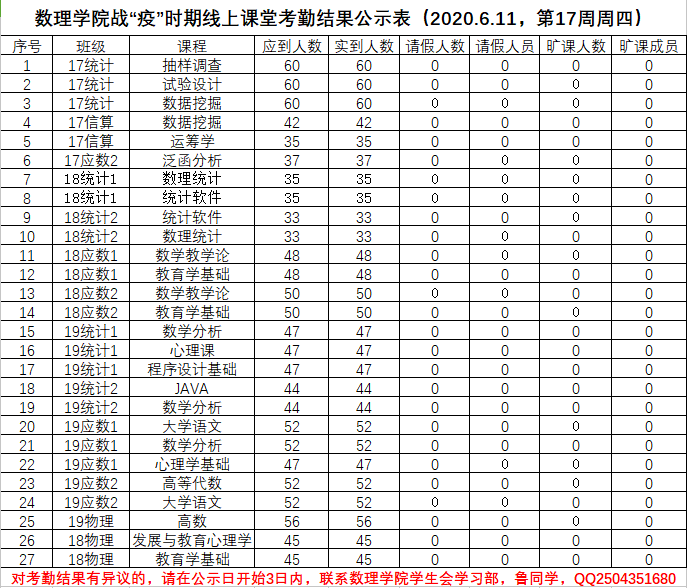3044永利战“疫”时期线上课堂考勤结果公示表(2020.6.11)